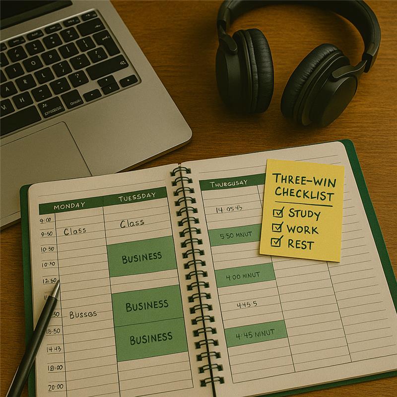 - Lock Non-Negotiables: Schedule classes, homework, extracurriculars, family time, and sleep first. Fit hustle tasks into remaining slots.